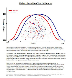 P.S. Here’s an image from an interesting post about “riding the the tails of the bell curve.” This is the distribution for men and women’s height. What’s interesting here is that only at the very end of the tails of the curve is there no overlap between women and men. The point is that, yes, there are a few men out there who are taller than any woman on the planet. But they’re rare. Mostly, men and women’s heights overlap a great deal. Why do we focus on those people out on the extremes instead of everyone in the middle?