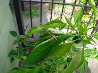 This morning as I was watering my poblano pepper plant, I noticed a little brown twig which turned out to be a praying mantis. I can’t remember having seen a brown praying mantis before, and he wasn’t blending in particularly well on my pepper plant, which is thankfully, still green. It turns out that praying mantis can change colors when they moult and it would certainly make sense this summer to take on a brown color rather than a green one, given the state of most of the plants.