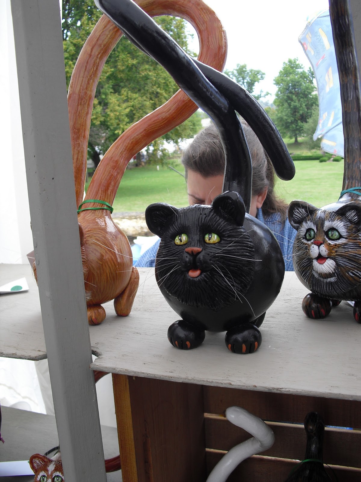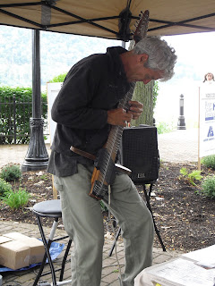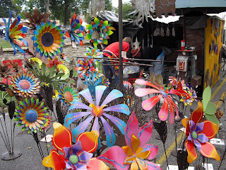 We saw a gorgeous variety of things to buy. These lovely metal garden flowers. Whimsical cats. I bought some gorgeous hand-painted merino wool from Wendy at Whirlwend, who was also selling felted bowls, scarves and purses. It was her first year at Chautauqua and she was so far impressed with the traffic. There was more music, including a gentleman playing an instrument that looked like an electric sitar and sounded quite delightful.