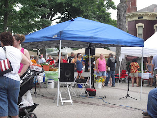 When I came home that summer, it was hard, because our farmer’s market is not quite there yet. But it’s making leaps and bounds forward, especially given that we’re just a town of 15,000 or so. We now have music. We have bread, some of it baked by our friends at the 605 Grille. We have artistes, as you can see. Locally made soap and locally made doggy treats. We have music, and you can get an omelet or some pancakes from the folks at Paradise Cove Catering, and more recently, you can get bagels or pizza from the folks at PiePie’s pizza. This Saturday, the folks from the Clearinghouse (an organization that would centrally locate social services for the underprivileged in Jefferson County all under one roof) were also at the market having a yard sale, where we purchased some lovely shades for our bedroom.