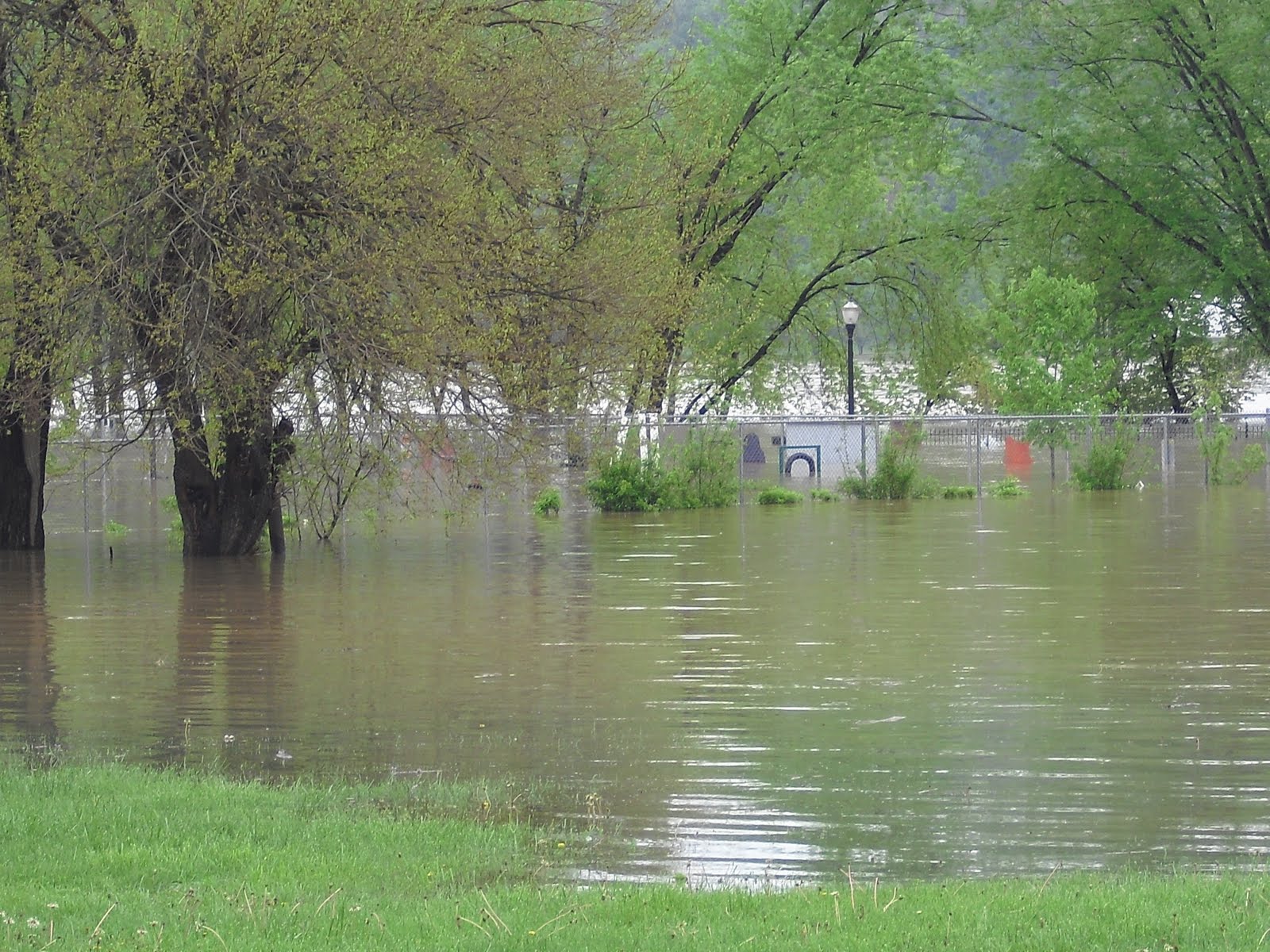Well, that’s a kind of a scary title for a blog post, so let me assure you first of all, that there’s no real disaster in Madison. The river is up, and certainly above flood level, and may reach a mark that would be on the list of top 15 highest readings. Vaughn Drive, the street in Madison that runs parallel and closest to the river, is closed all the way through town. The dog park is under water, and the lawn behind Lanier Mansion again. Down river in Louisville, Waterfront Park is under water, and the bad news is, there’s more rain in the forecast.