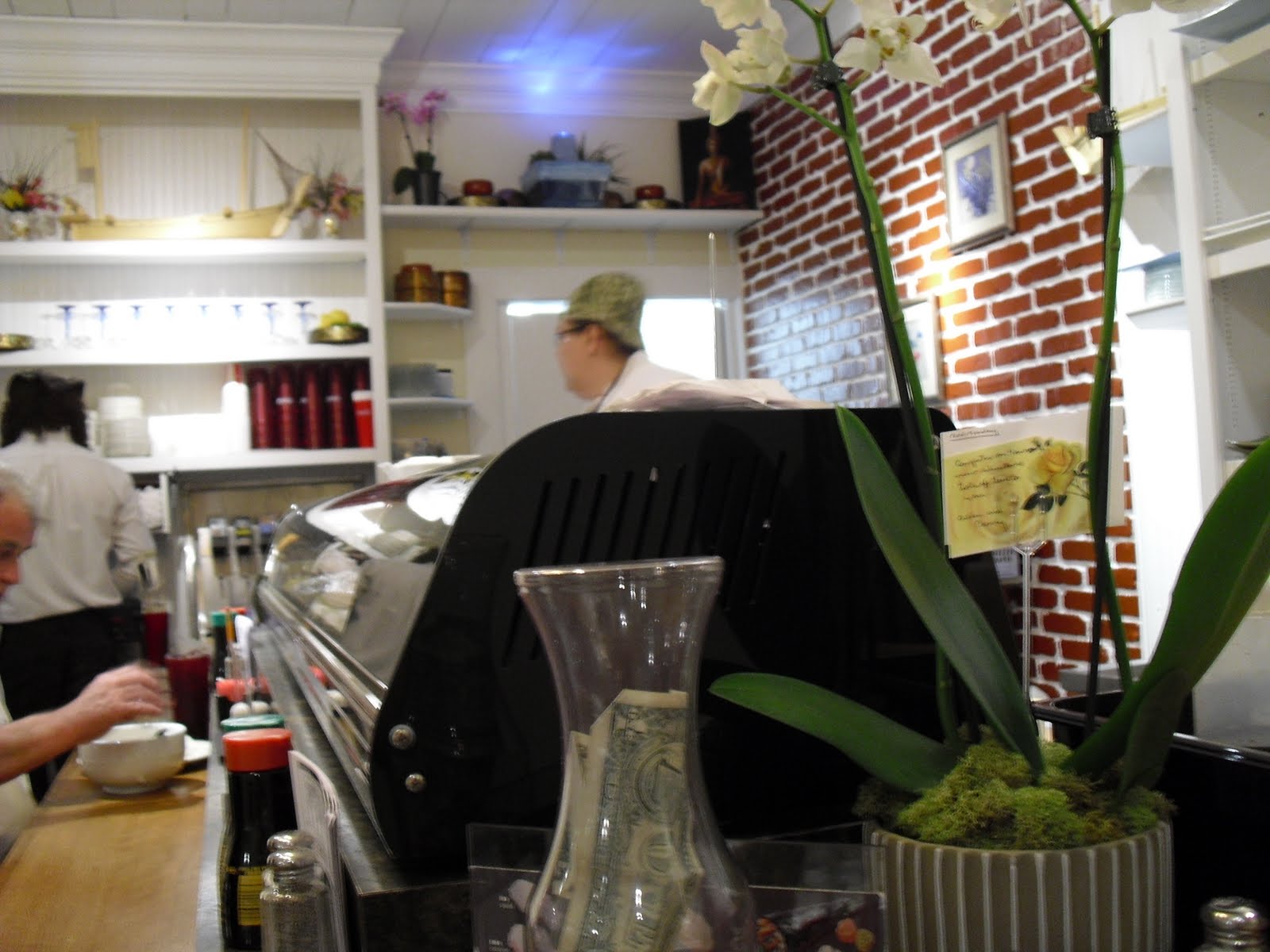Yes!  Woo-hoo, woo-hoo!  Much celebration, we have a real sushi restaurant, with a real sushi chef.  It even looks like a real sushi restaurant.  And they made me an avocado roll today (yes, readers, I’m a vegetarian who also generally does not eat fish, even the raw kind).  Yummy, yummy and yummier.  One woman in the restaurant had driven all the way from Carollton (which, okay, is not that far, but still).