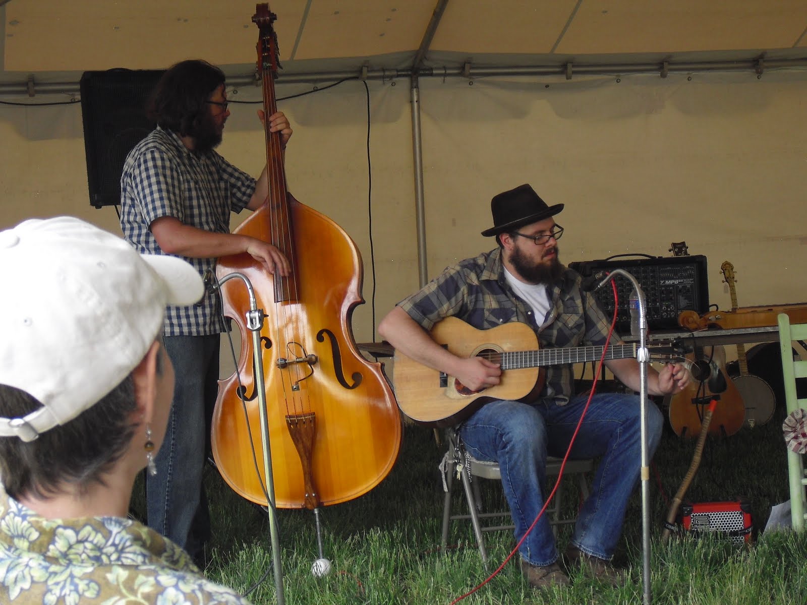 At some point, someone who had ventured out for a beer in the rain said, “Hey, there’re these women in the beer tent playing banjo and fiddle and an upright bass.” And I said to my husband, “That’s Uncle Earl!” So, sure enough, down in the beer tent Uncle Earl was playing surrounded by heaving masses of people packed in to stay dry. The folk fest coordinator, Madison’s own Greg Ziessmer, told us that they’d asked him if it was okay, while it was raining and no one was on the stage (there was some lightning, too, which had shut down the music) for them to go play in the beer tent. I’m hoping no one in the band was claustrophobic, because they were right in the middle of everyone, just wailing away. Only at folk festival.