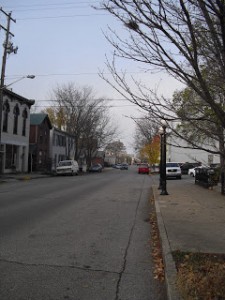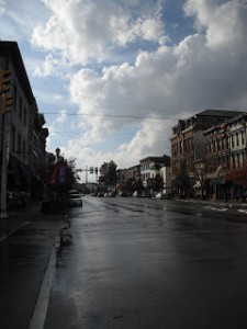 The view down Main St. is similar. If you stand anywhere vaguely close to the place where West St. turns to follow the curve of the river, you have a lovely view down the street. You can see the buildings on the straight part of the street in front of you, and then the buildings curving away around the corner from you past the place where the town bends. I remember after I had first bought my house downtown and started actually paying attention to such things, I would be driving into downtown from the west, and wonder which steeple that was, visible from far down Main St., looking as if at first there’s a church right in the middle of the street. And then I realized it was the steeple from the church right next door to my house, which is not on Main St. at all. But because of the particular angle of Main St., from far away the steeple of Prince of Peace stands out in the distance directly above Main St. There was something so incredibly delightful about this, the idea that from almost anywhere in town, I could see exactly where home was.