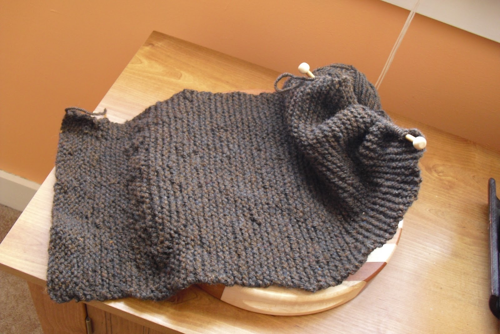 So, I’ve been knitting and thinking, and thinking about knitting, and thinking about the thinking I do as I’m knitting. I realized pretty quickly that there’s something meditative for me about knitting. Part of it is that I find it relatively easy to let go of my need for everything to be perfect while I’m knitting. There are many other activities I engage in where I find it very hard to let go of my perfectionism and obsession with the finished product rather than the process. Here’s a short partial list: playing the fiddle, making jewelry, baking, cooking, painting, teaching classes, writing, raising a child, etc. For some reason with knitting, I find it very easy to think less about the product than the process itself. Maybe it’s because the process itself (at least for the very basic knitting I’m doing) doesn’t take a whole lot of thought. Maybe it’s because I have no ambition to become a great knitter. Maybe it’s the incredible slowness (for me) of the process. Before Christmas, everyone kept asking me who I was knitting the scarf for and making jokes about whether it would be finished by Christmas. The scarf is still not finished, I don’t know who it’s for (I’ll probably be the only one willing to wear it), and I really don’t care.